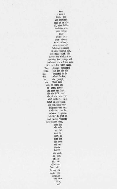 tat, das war ihre Methode, sie zu zeigen, ihre Ungeduld. Leitartikel aus einer Zeitung von FormatMan fragt sich vielleicht, warum die Leute mitunter, wenn von der Unendlichkeit die Rede ist, regelrecht aus den Latschen kippen. Das hat nichts mit Heuchelei zu tun, der Grund dafür sind echte Selbstzweifel. Angesichts der allgemeinen Mystifizierung, die uns gleich einem Leichentuch von den Schultern herabhängt, sollten wir nicht aufheulen, wenn einer unserer Bekannten das Schwert niedersausen läßt. Mit so was muß man schließlich immer rechnen. Ungeklärtes ZuckenIn dem anschließenden Taumel zerfließt der Körper in ein ungeklärtes Zucken, ungeklärt infolgedessen, daß er einige Zeit vor dem Ruf zur Ruhe gelegt wurde. Wobei der „Ruf“ nicht als Ruf im übertragenen Sinne zu sehen ist; wird doch sein Ursprung derart sein, daß Vorhersagen dort auf große Schwierigkeiten stoßen. Auch muß man den vorausgegangenen Zustand des Unwohlseins bedenken. Natürlich trifft es zu, daß Vorsicht geboten ist, wenn man ein Urteil wagt, aber nichtsdestoweniger, nichtsdestoweniger würde ich sagen, wenn Sie den Drang haben zu springen, dann springen Sie doch. Eine alte GeschichteSie lief schon seit ner Ewigkeit in dieser niedergeschlagenen